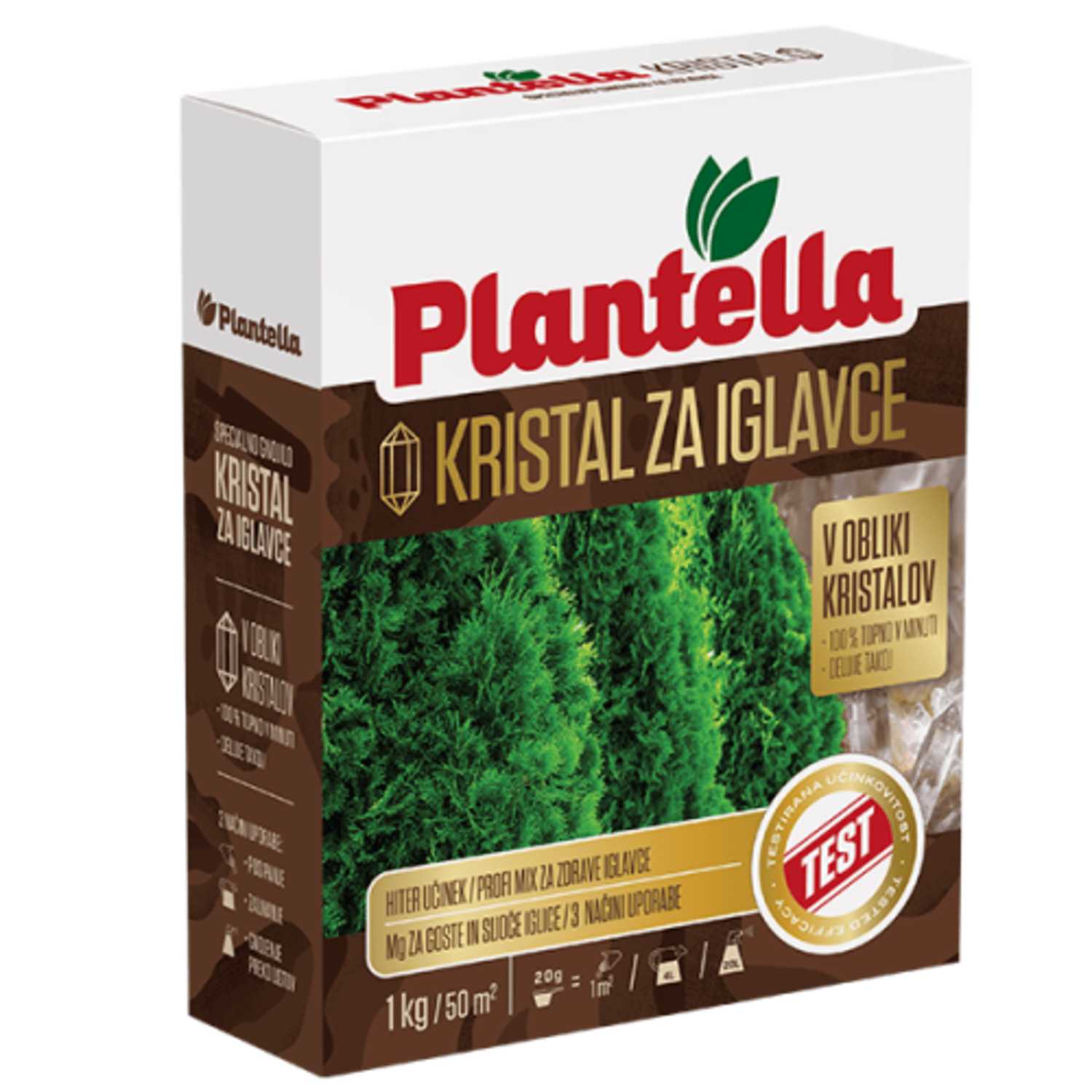 Specijalno gnojivo Plantella Kristal za četinare je prilagođeno svim zahtjevima četinjača. Omogućava pravilnu prehranu biljaka, dobar rast i zdrav izgled svih vrsta četinjača. Dodatak magnezija sprječava da iglice posmeđe. Upotrebljava se za gnojenje jelki, borova, smreka, ariša, tisa, kao i klekova, borovica itd.